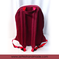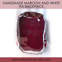 A sturdy handmade itabag backpack featuring a mulit-colored, maroon and white design. It comes with 2 drink carrier pockets on the side and has a rainbow metal zipper.
