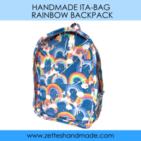 An cute handmade itabag backpack featuring a rainbows and unicorns patterned design.